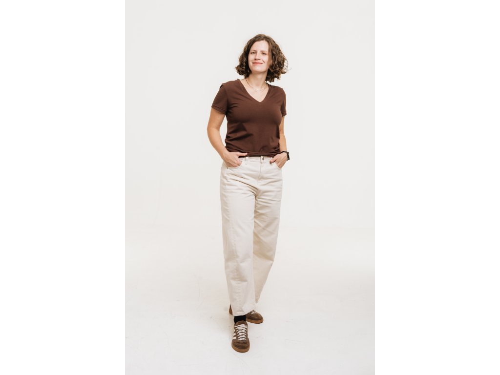 Pružná organická bavlna se ti přizpůsobí, výstřih do V zvýrazní, co má, a jemné prošití po páteři připomene, že síla je v detailech.
